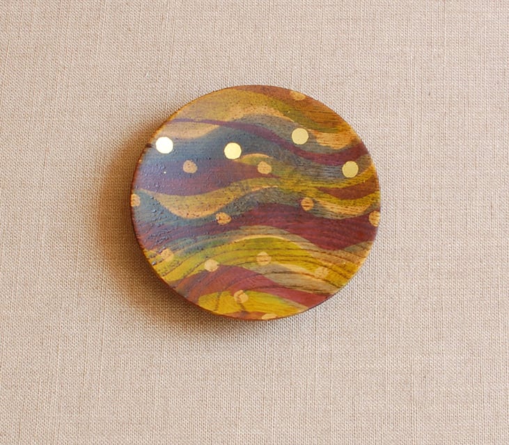 模様は、日本の伝統技法"ろうけつ染"による染色と、"漆"の技法で描かれています。